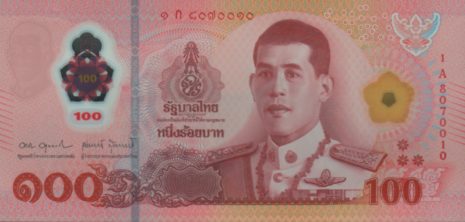 B202 (PNL): 100 บาท (baht) (US$3.05) Red, orange, brown, and green. Front: Thai text; Maha Vajiralongkorn Bodindradebayavarangkun (Rama X) wearing Royal Thai Air Force uniform; Royal Garuda emblem. Back: Thai text; Royal Garuda emblem; Rama V and Rama VI. Simulated security thread with demetalized 100 บาท/ 100 BAHT. Watermark (shadowRead More…