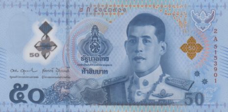 B201 (PNL): 50 บาท (baht) (US$1.50) Blue. Front: Thai text; Maha Vajiralongkorn Bodindradebayavarangkun (Rama X) wearing Royal Thai Air Force uniform; Royal Garuda emblem. Back: Thai text; Royal Garuda emblem; Rama III and Rama IV. Simulated security thread with demetalized 50 บาท/50 BAHT. Watermark (shadow image): Rama X. Printer: (NoteRead More…