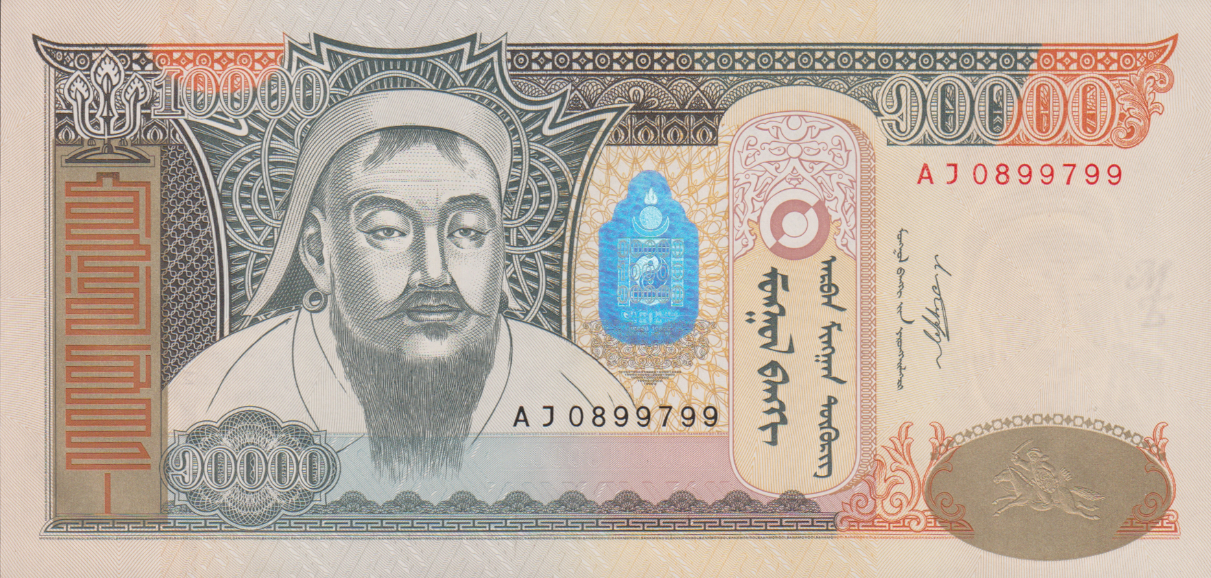 Orange, black, red, and brown. Front: Mongolian text; Chinggis Khaan; holographic Soyombo symbol; warrior on horseback. Back: Mongolian text; building courtyard with tree-like water fountain. Windowed security thread with demetalized MONGOLBANK. Watermark: Chinggis Khaan and electrotype МБ. Printer: (Giesecke & Devrient). 150 x 72 mm. Paper.