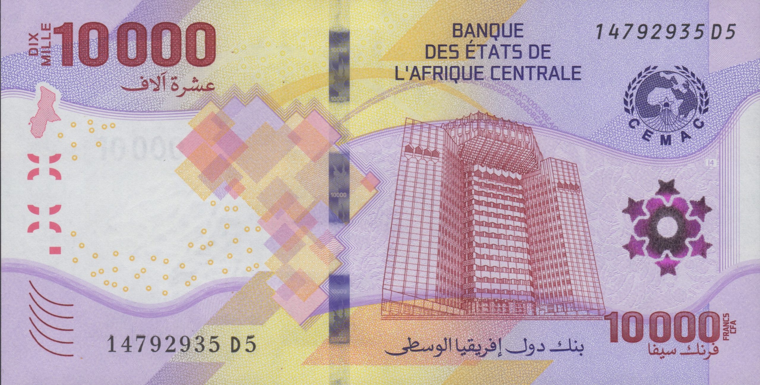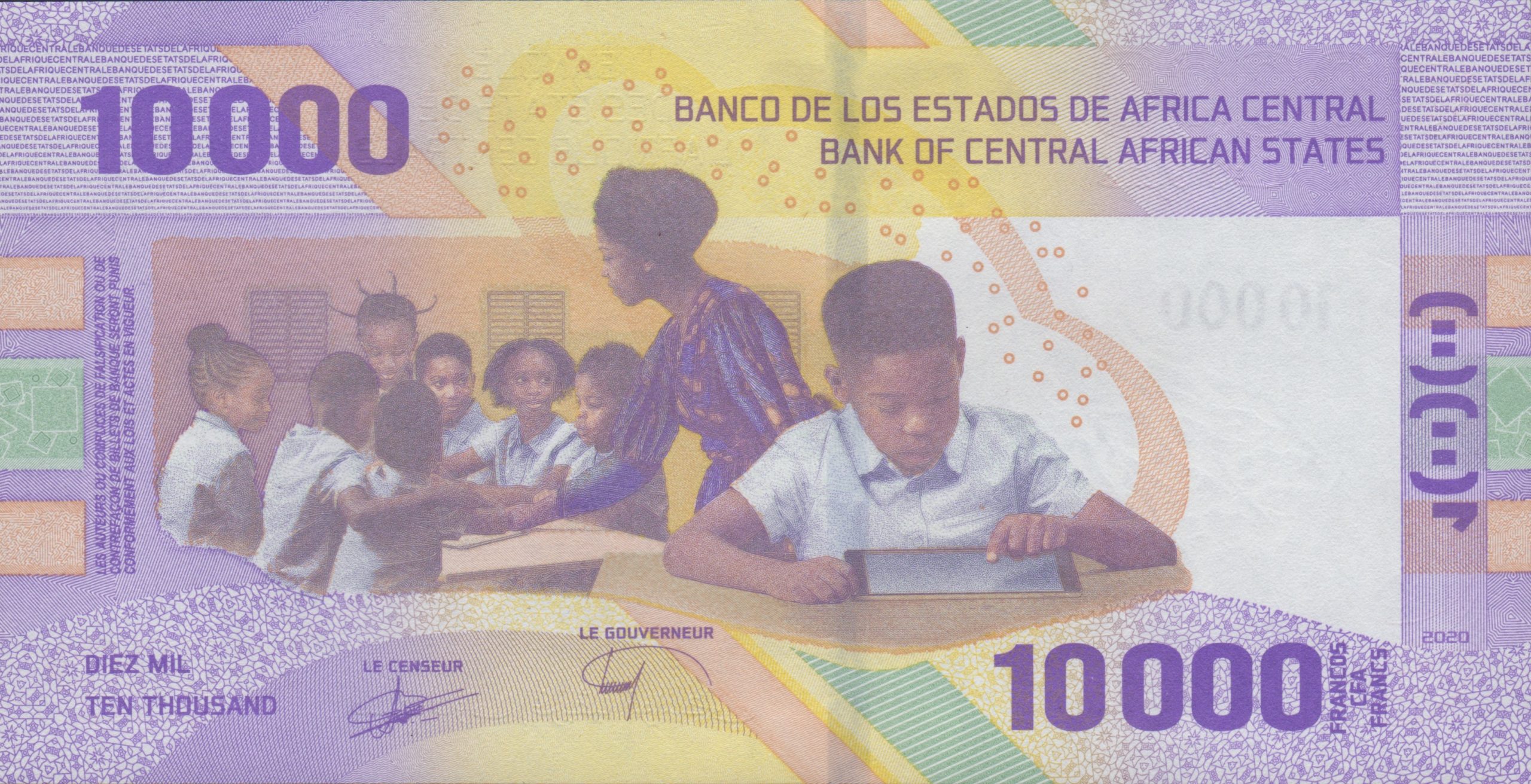 Purple, yellow, red, green, and orange. Front: Arabic and French text; outline map of CEMAC; denomination as registration device; stylized map of Africa in diamonds; BEAC headquarters building in Yaoundé, Cameroon; CEMAC logo; purple-to-gold stars in SPARK Orbital. Back: French text; standing teacher instructing seven seated children; young boy with touch-screen tablet. Motion windowed security thread with demetalized 10000 and antelope head. Watermark: Three eland antelope heads and electrotype 10000. Printer: (Unknown). 145 x 74.5 mm. Paper.