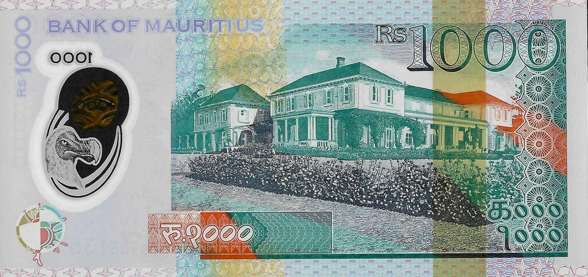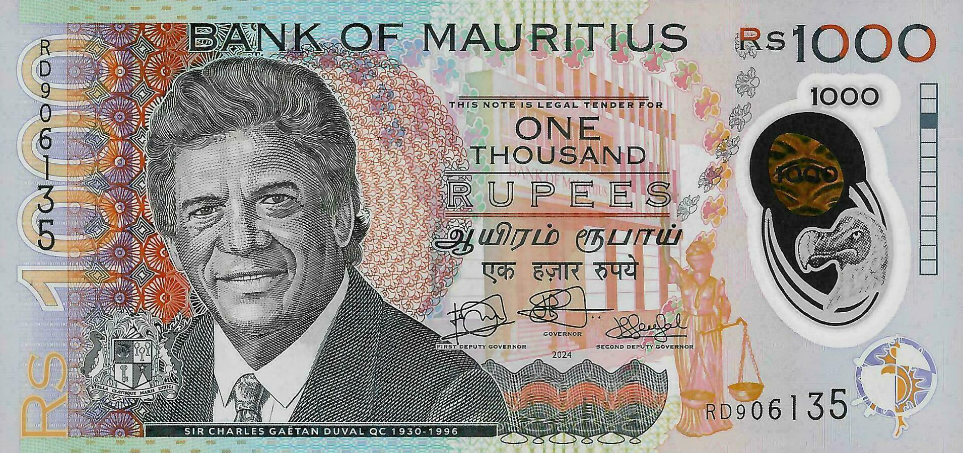 Blue. Front: English, Hindi, and Tamil text; coat of arms; Charles Gaetan Duval; bank building façade; standing Justice with sword and scales; SPARK Flow PRIME dodo egg; spider conch shell as registration device. Back: English, Hindi, and Tamil text; spider conch shell; Château of Réduit (official residence of the president). No security thread. Watermark (shadow image): RS. Printer: (Oberthur Fiduciaire). 160 x 76 mm. Polymer.