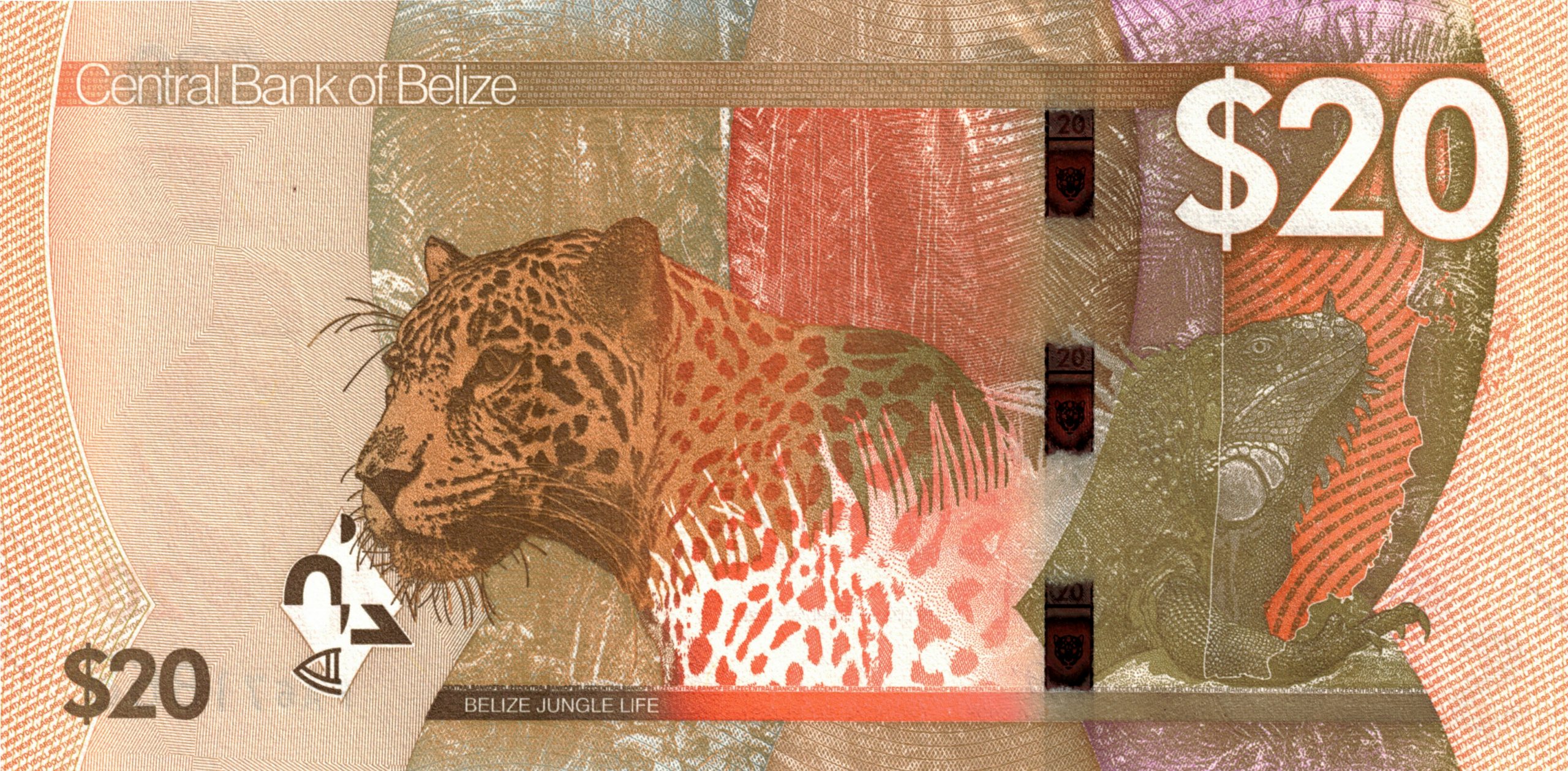 Brown. Front: English text; George Cadle Price; coat of arms; Baird’s tapir; denomination as registration device. Back: English text; denomination as registration device; jaguar (Panthera onca); green iguana. Holographic foil stripe thread with $20 and blue morpho butterfly. Windowed security thread with demetalized 20 and jaguar head. Watermark: George Cadle Price and electrotype 20. Printer: (De La Rue). 140 x 70 mm. Paper.
