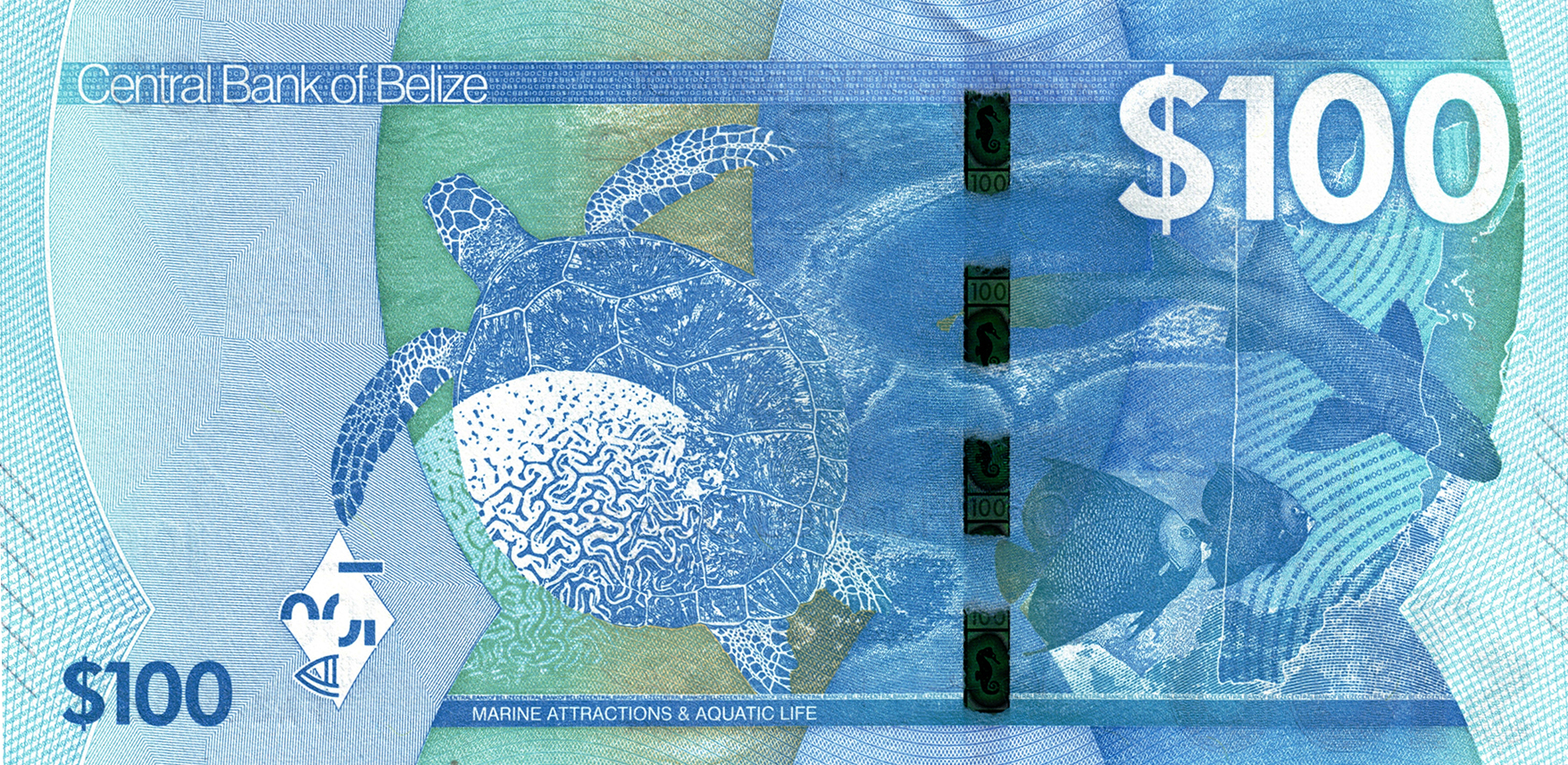 Blue. Front: English text; George Cadle Price; coat of arms; Queen triggerfish (Balistes vetula); denomination as registration device. Back: English text; denomination as registration device; Hawksbill sea turtle; Great Blue Hole; two French angelfish; nurse shark (Ginglymostoma cirratum); grooved brain coral (Diploria labyrinthiformis). Holographic foil stripe with keel-billed toucan and Hawksbill sea turtle. Windowed security thread with demetalized 100 and Longsnout/Slender seahorse. Watermark: George Cadle Price and electrotype 100. Printer: (De La Rue). 150 x 75 mm. Paper.