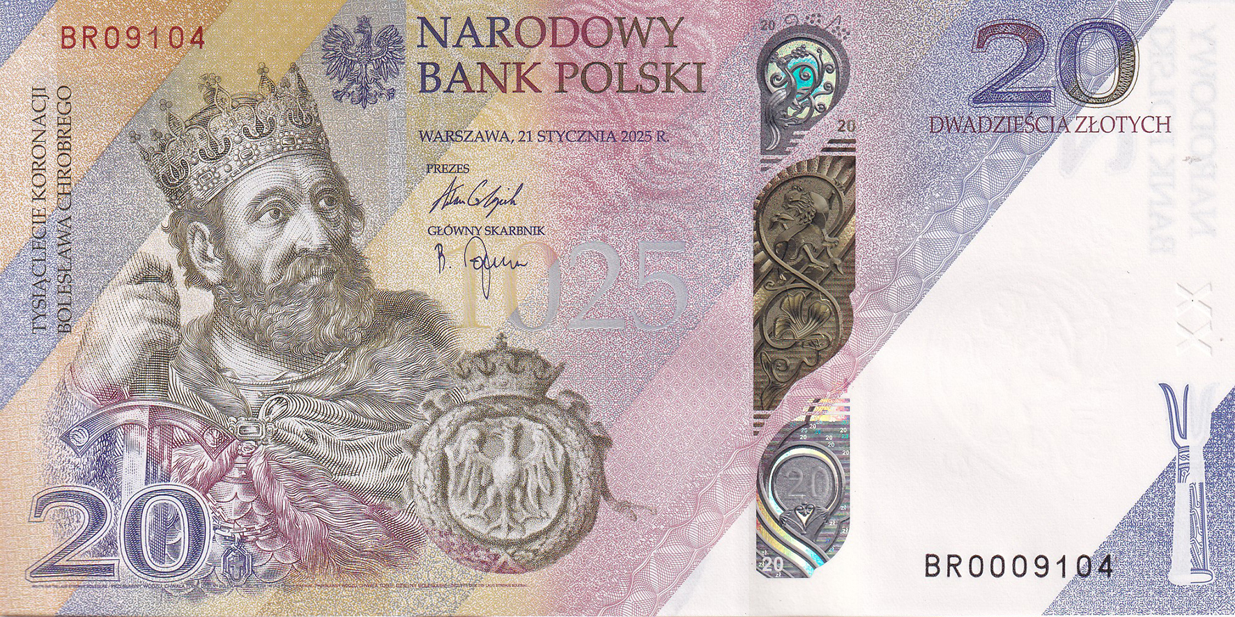 To commemorate the 1,000th anniversary of the coronation of Bolesław Chrobry, the National Bank of Poland sold 70,000 new 20-złoty notes packaged in a folder beginning on 5 November 2025.