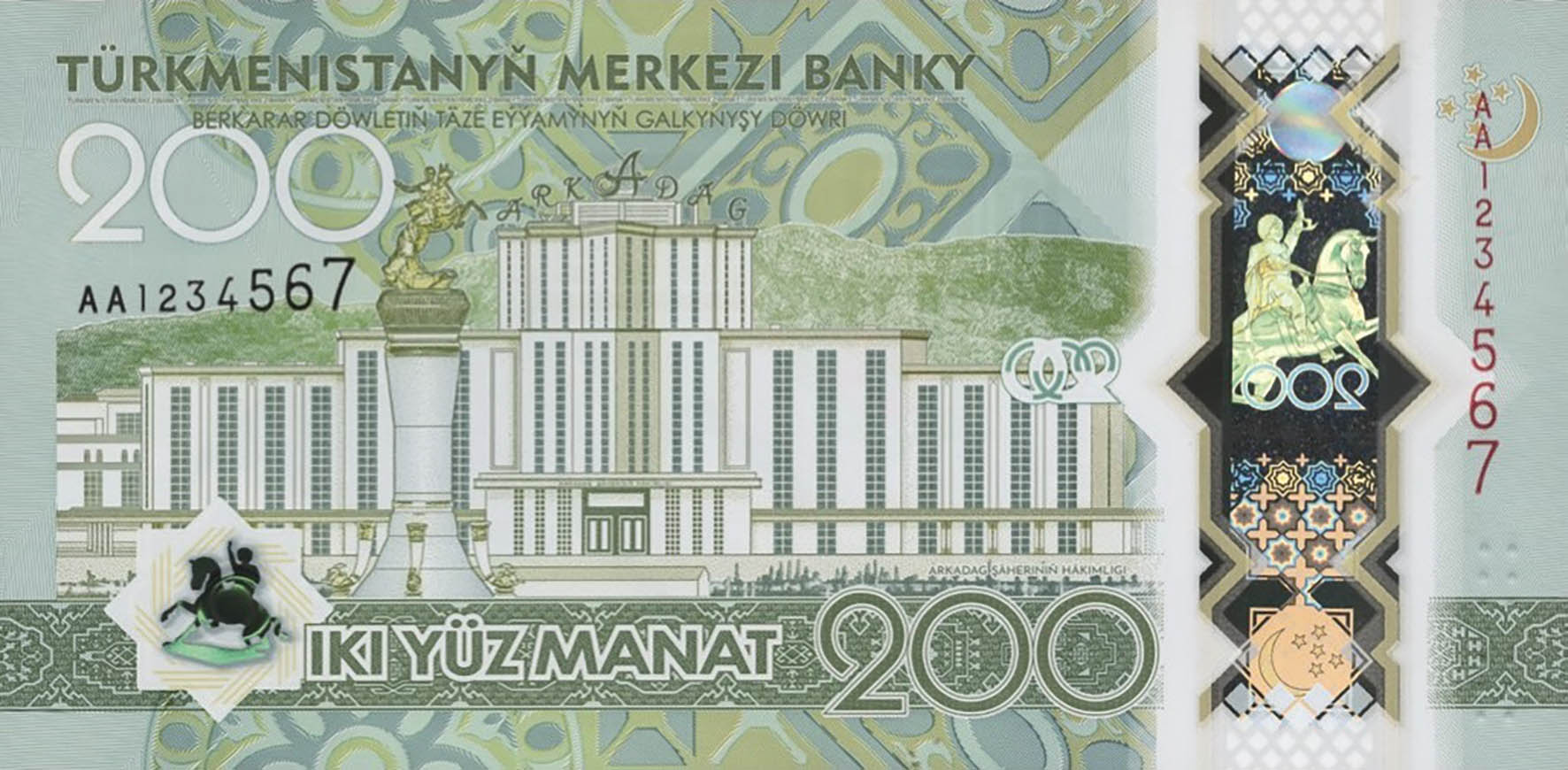 Green. Front: Turkmen text; 30th anniversary logo; denomination as registration device; map of Turkmenistan; coat of arms; Arkadag Monument; denomination in green SPARK. Back: Turkmen text; administrative building of the city of Arkadag city Hyakimlik; five stars and crescent moon. Holographic stripe. No security thread. Watermark: None. Printer: (Unknown). 150 x 75 mm. Polymer.