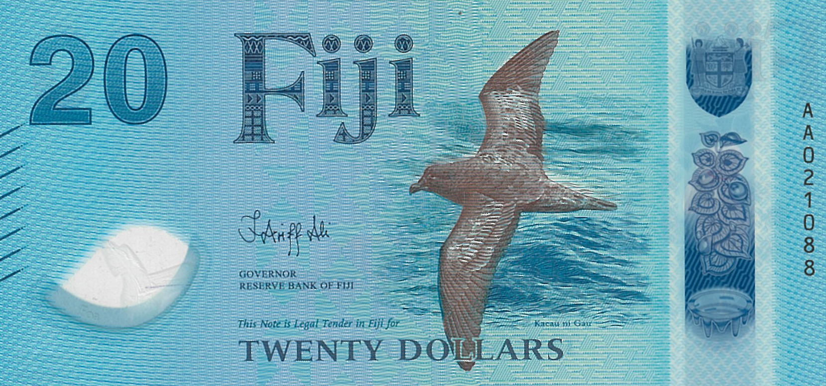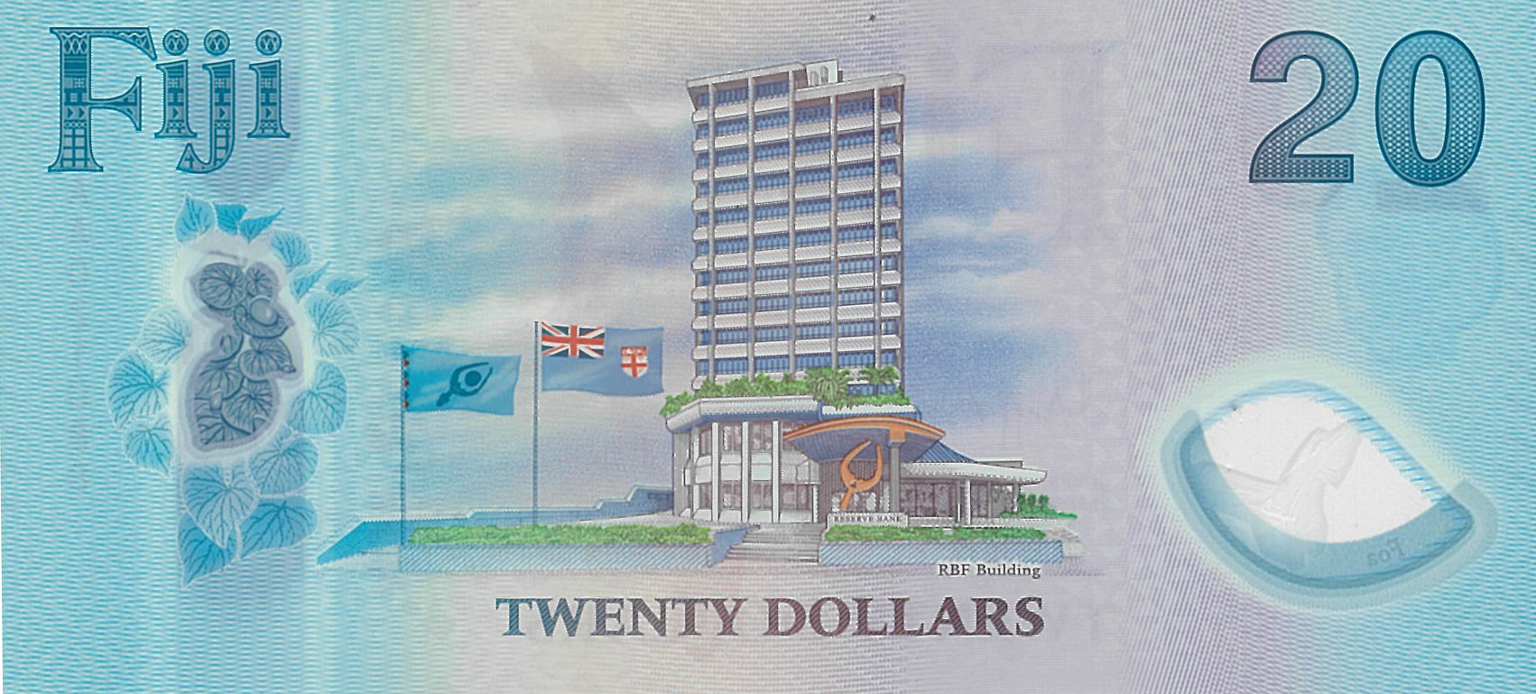 Blue. Front: English text; kacau ni gau (Fiji petrel) bird flying over waves; Fijian coat of arms, leaves, kava bowl. Back: English text; leaves; flags flying outside RBF headquarters building. No security thread. Watermark (shadow image): Fijian head. Printer: (Crane Currency). 146 x 67 mm. Polymer.