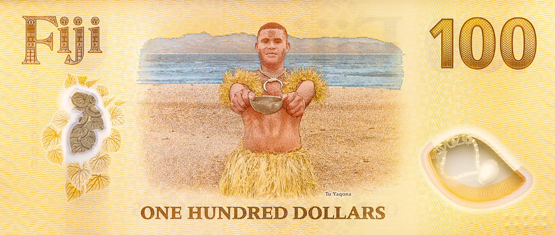 Yellow. Front: English text; nanai (cicada) insect; Fijian coat of arms, leaves, kava bowl. Back: English text; leaves; Fijian man (Tu Yaqona) wearing traditional attire, standing on beach offering ceremonial kava drink in coconut shell (bilo). No security thread. Watermark (shadow image): Fijian head. Printer: (Crane Currency). 156 x 67 mm. Polymer.