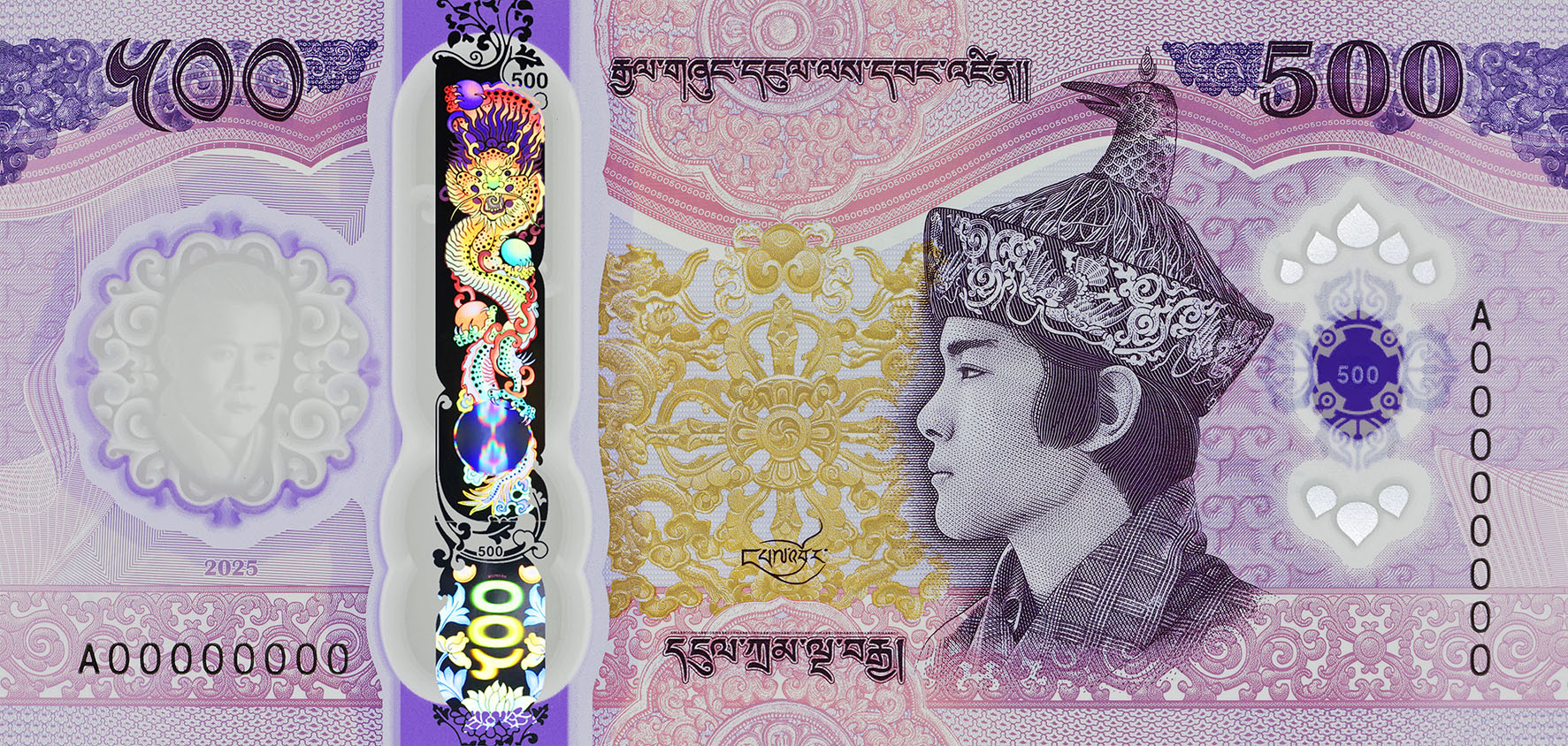 Pink, purple, gold, and green. Front: Dzongkha text; cross-vajra, an ancient Buddhist symbol denoting indestructibility and permanent stability; 4th king, Jigme Singye Wangchuck, wearing Raven Crown. Back: Dzongkha and English text; seal of the state; Khamsum Yulley Namgyal Chorten; Punakha Dzong (aka Pungtang Dechen Photrang Dzong, meaning “the palace of great happiness or bliss”); two Bhutan Glory butterflies. Holographic security stripe. No security thread. Watermark (shadow image): Jigme Khesar Namgyel Wangchuck. Printer: (Unknown). 150 x 72 mm. Polymer.