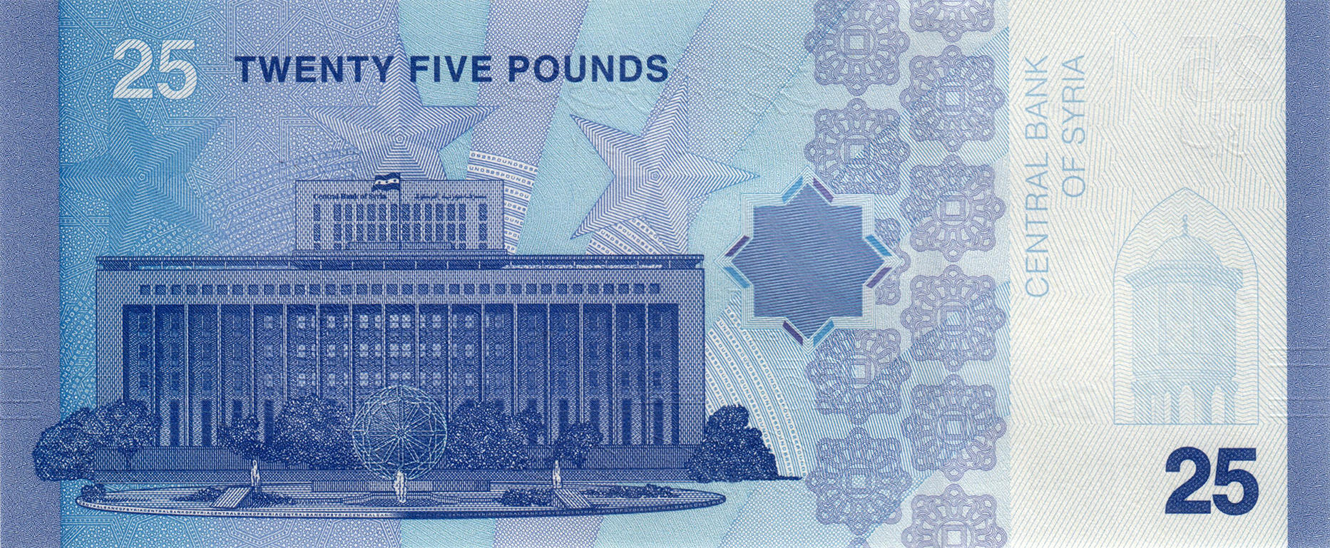 Blue, green, and red. Front: Arabic text; unknown bird; eagle with stars, emblem of Syrian Republic; concave hexadecagon as registration device; mulberry branch with leaves and fruit; Arabesque pattern. Back: English text; three five-pointed stars arched above Central Bank of Syria headquarters building in Damascus; concave hexadecagon as registration device; Dome of the Treasury at Umayyad mosque in Damascus. Blue windowed security thread with wavy line. Watermark: Unknown. Printer: (Goznak). 157 x 65 mm. Paper.