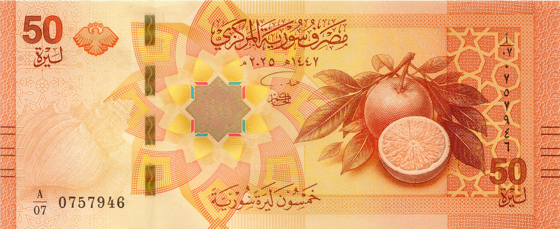 Orange, red, yellow, purple, and blue. Front: Arabic text; conch shell; eagle with stars, emblem of Syrian Republic; concave hexadecagon as registration device; orange tree branch with leaves and fruit; Arabesque pattern. Back: English text; three five-pointed stars arched above Central Bank of Syria headquarters building in Damascus; concave hexadecagon as registration device; Dome of the Treasury at Umayyad mosque in Damascus. Gold windowed security thread with wavy line. Watermark: Unknown. Printer: (Goznak). 157 x 65 mm. Paper.
