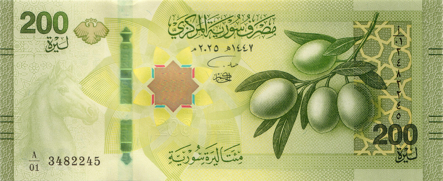 Green, yellow, and tan. Front: Arabic text; Arabian horse head; eagle with stars, emblem of Syrian Republic; concave hexadecagon as registration device; olive tree branch with leaves and fruit; Arabesque pattern. Back: English text; three five-pointed stars arched above Central Bank of Syria headquarters building in Damascus; concave hexadecagon as registration device; Dome of the Treasury at Umayyad mosque in Damascus. Winged windowed holographic security thread. Watermark: Unknown. Printer: (Goznak). 157 x 65 mm. Paper.