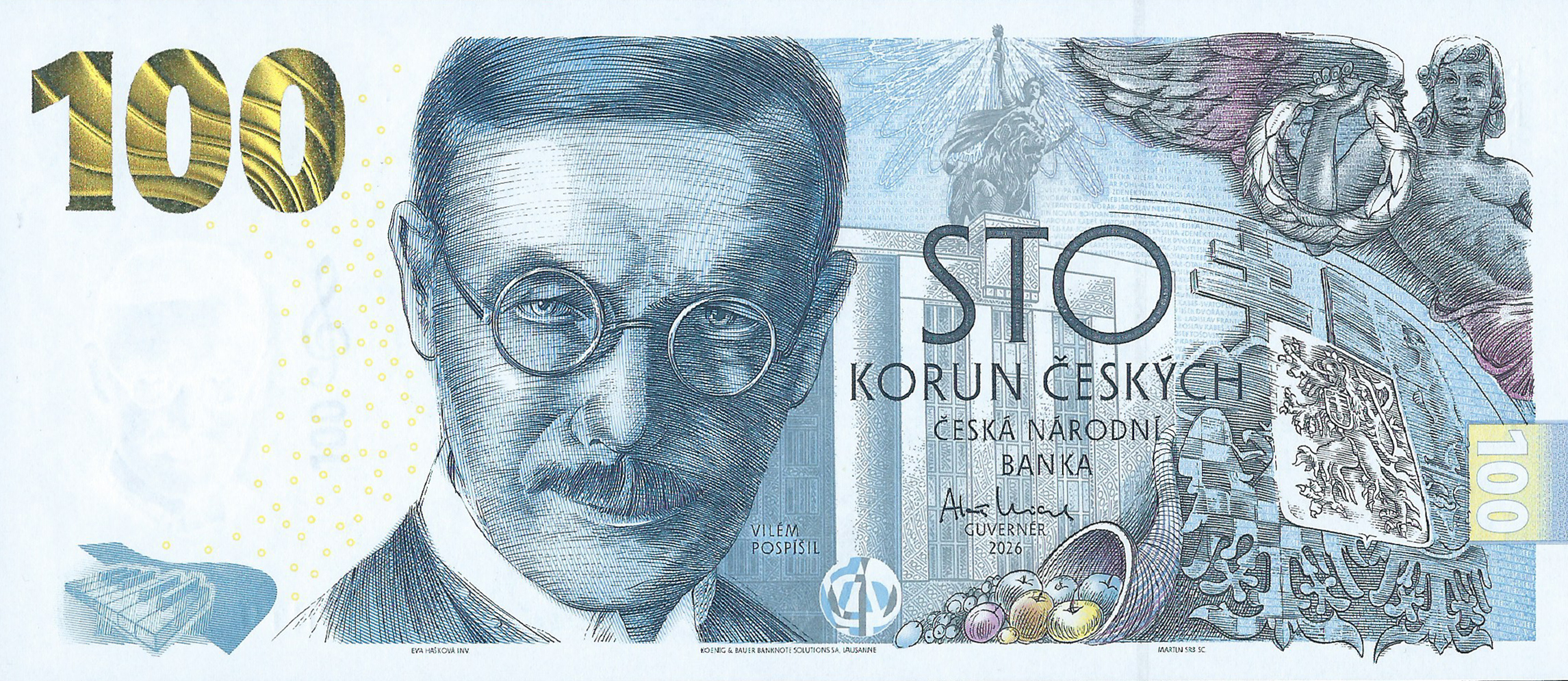 Blue, purple, yellow, and black. Front: Czech text; denomination in SPARK Flow; piano keys; Vilém Pospíšil; Czech National Bank in Prague; cojoined letters as registration device; cornucopia; coat of arms; male angel holding laurel wreath. Back: Czech text; fruits; corner of the former Městská spořitelna Pražská savings bank; cojoined letters as registration device; bare-breasted angel leaning on coat of arms and holding bee hive. Solid security thread. Watermark: Vilém Pospí with electrotype flower and 100. Printer: STATNI TISKARNA CENIN, PRAHA. 194 x 84 mm. Paper.