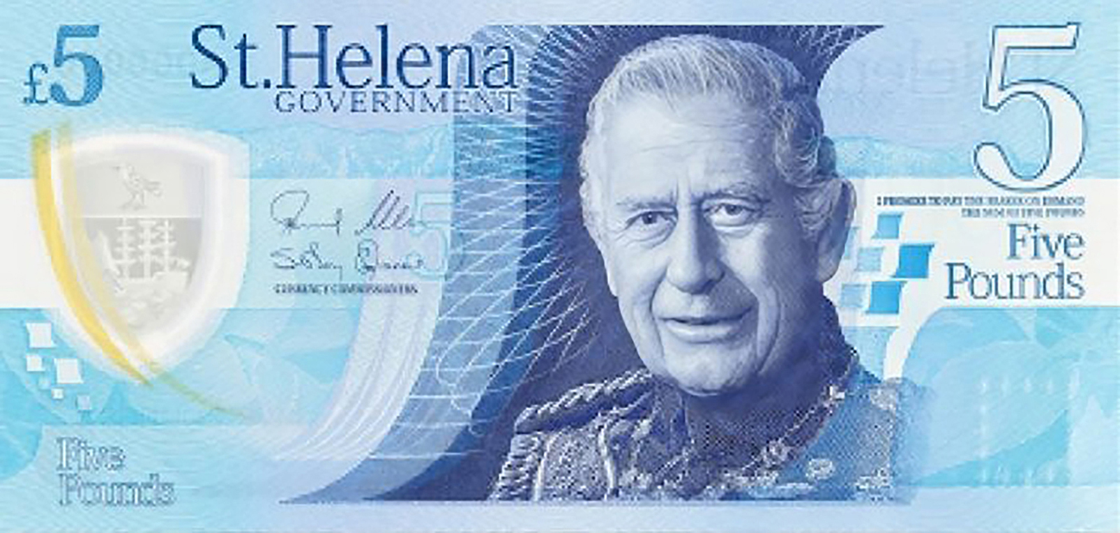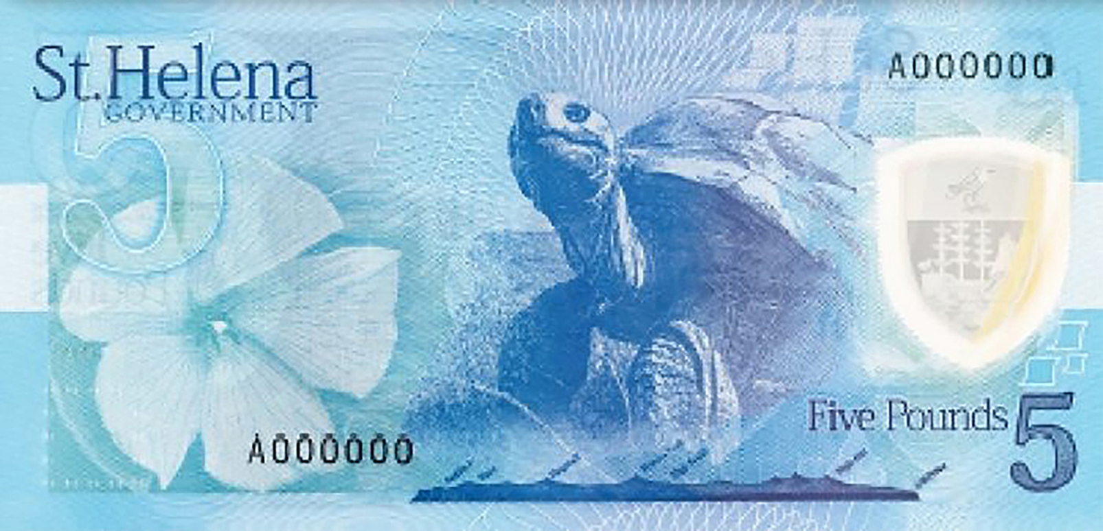 Blue. Front: English text; King Charles III. Back: English text; Saint Helena ebony (Trochetiopsis ebenus) flower; Jonathan the Tortoise, a Seychelles giant tortoise (Aldabrachelys gigantea hololissa). No security thread. Watermark: None. Printer: (De La Rue). 135 x 70 mm. Polymer.