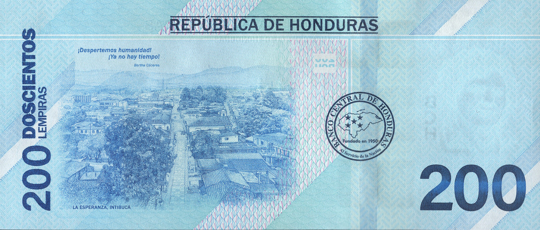 Blue, green, yellow, red, orange, and purple. Front: Spanish text; denomination in SPARK; denomination as registration device; colored squares representing traditional Lenca loom; Bertha Isabel Cáceres Flores; Gualcarque river and trees. Back: Spanish text; Bertha Cáceres’ quote ¡Despertemos humanidad! / ¡Ya no hay tiempo! (Let us awaken humanity! There is no more time!”); aerial view of La Esperanza, Intibucá, birthplace of Bertha Cáceres; denomination as registration device; seal of Banco Central de Honduras. Green-to-blue windowed security thread with demetalized BCH. Watermark: Bertha Cáceres and electrotype BCH. Printer: (Crane Currency, Malta). 156 x 67 mm. Paper.