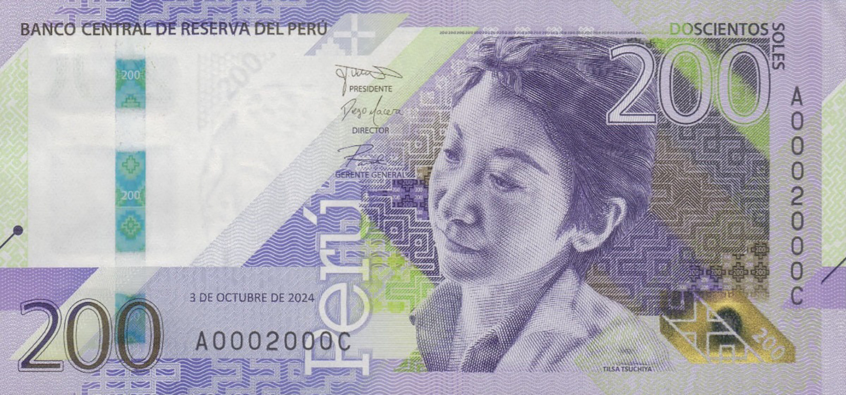Like B541a, but new signatures (Macera/Velarde/Castillo), new date (3 DE OCTUBRE DE 2024), and new 5-mm wide blue and green windowed security thread with demetalized 200.