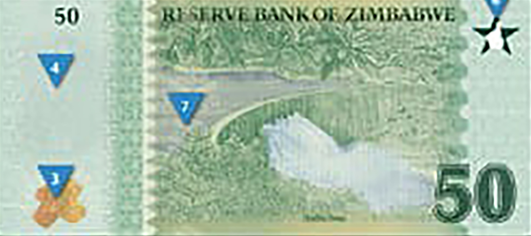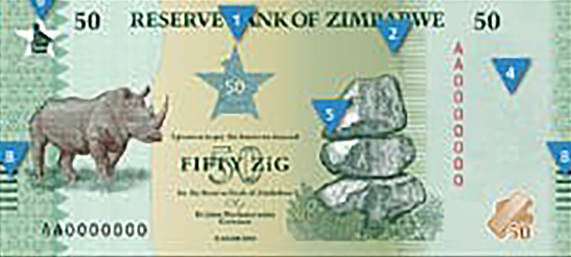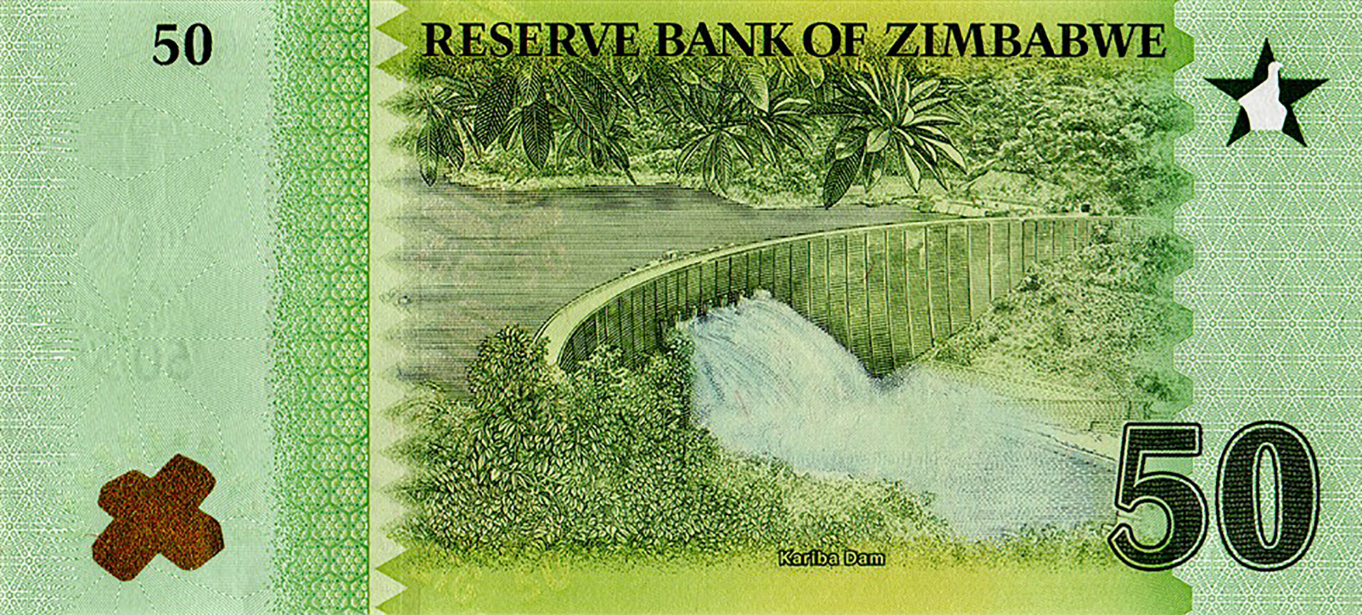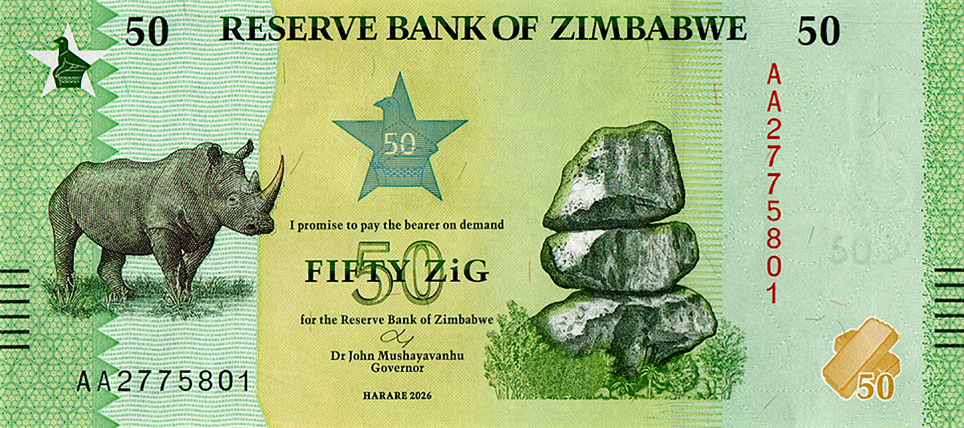 Green. Front: English text; Zimbabwe bird on star as registration device; rhinoceros; Zimbabwe bird on star as PEAK device; Chiremba balancing rocks in Epworth; gold bars. Back: English text; gold bars in gold-to-green ColorShift; Kariba dam; Zimbabwe bird on star as registration device. Solid security thread with demetalized 50 ZIG. Watermark: Zimbabwe bird and electrotype 50. Printer: (Unknown). Dimensions unknown. Paper.
