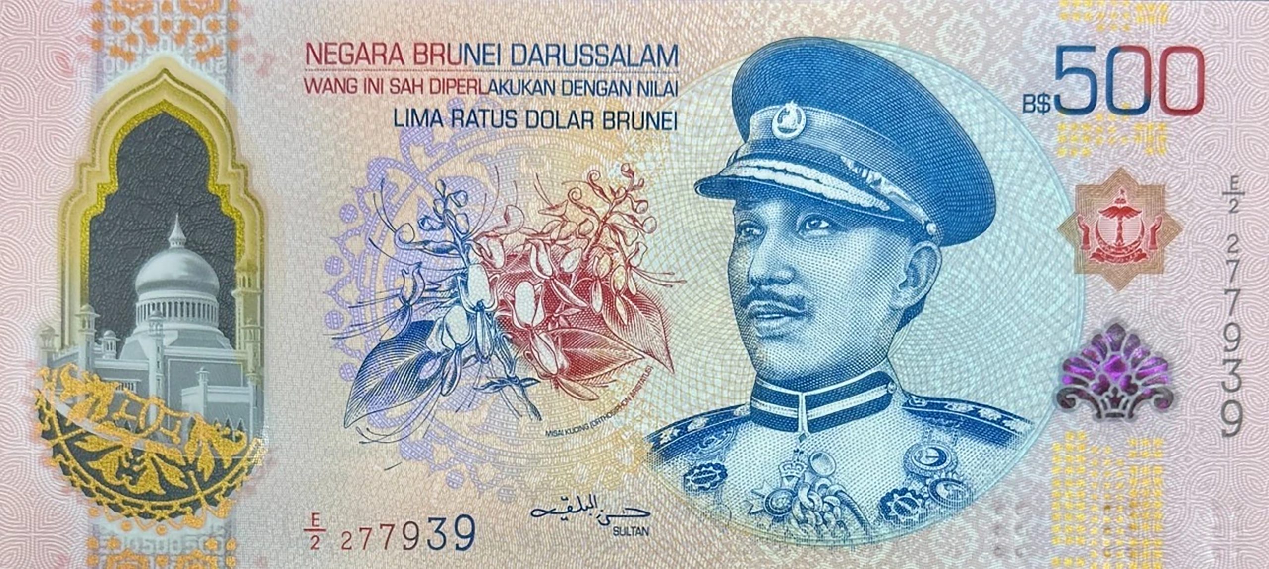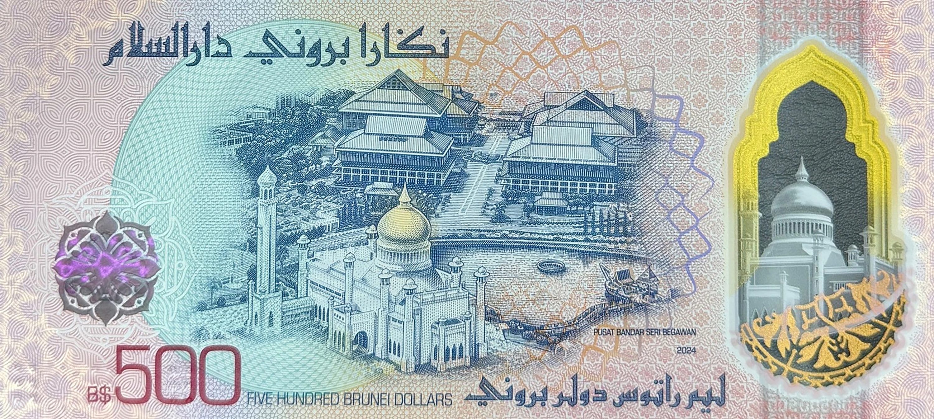Purple. Front: Malay text; Omar Ali Saifuddin mosque in Bandar Seri Begawan; Misai kucing (orthosiphon aristatus) java tea flowers; Sultan Omar Ali Saifuddin III wearing uniform and cap; coat of arms. Back: English and Malay text; Omar Ali Saifuddin mosque in Bandar Seri Begawan; lagoon; Sultan Haji Hassanal Bolkiah Foundation (Yayasan) building. No security thread. Watermark (shadow image): Unknown. Printer: (Unknown). 175 x 80 mm. Polymer.