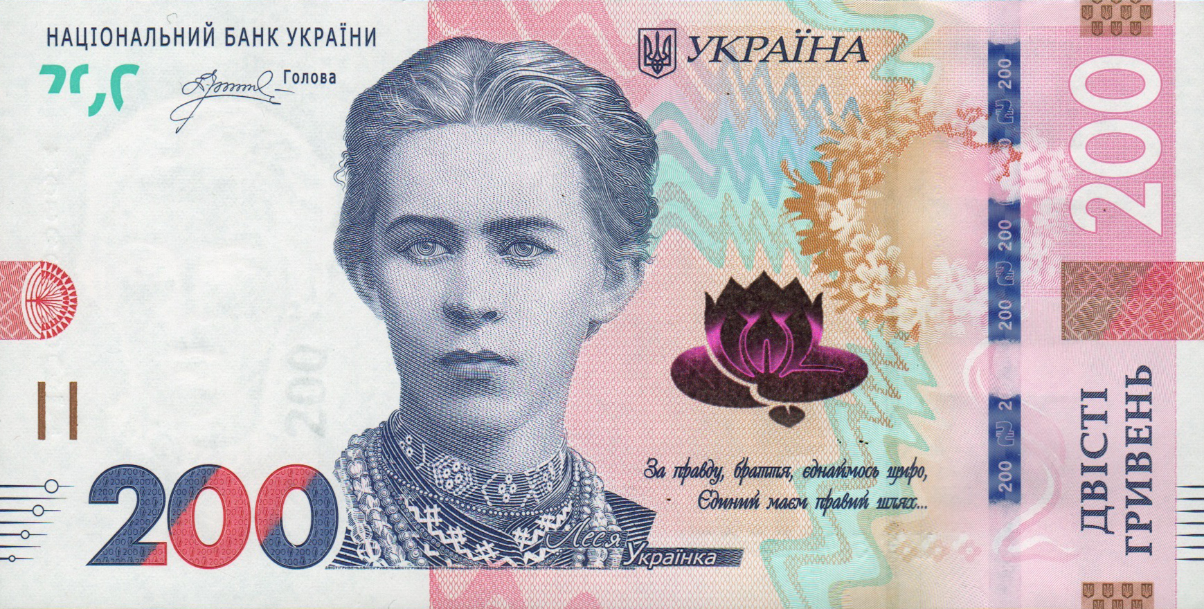 Pink and blue. Front: Ukrainian text; stylized tree; denomination as registration device; poet and writer Lesya Ukrainka; Ukrainian coat of arms; waterlily in SPARK; wreath. Back: Ukrainian text; trees outside Tower of Lubart’s Castle in Lutsk; birds in flight; Ukrainian slogan. Motion windowed security thread with demetalized 200. Solid security thread with demetalized 200 ГРН and trident. Watermark: Lesya Ukrainka and electrotype 200. Printer: (National Bank of Ukraine). 148 x 75 mm. Paper.