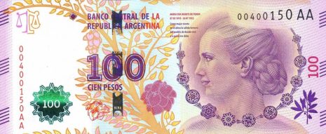 B416 (P360): 10 pesos (US$0.20) Brown, green, blue, and purple. Front: Spanish text; sunburst as registration device; green-to-blue OVI flower; leaves on branches; OVI patch of solider with raised flag on horseback; Manuel Belgrano in military uniform; OVI patch of Pedrito Ríos, drummer boy of Tacuarí. Back: Spanish text; JuanaRead More…